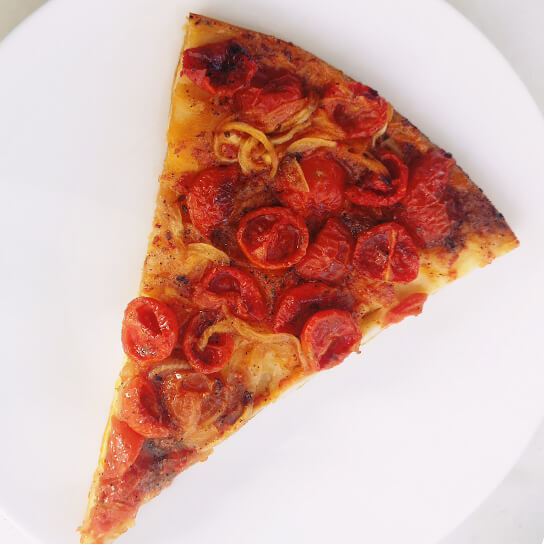Arrange tomatoes over dough and top with onion rings and capers.